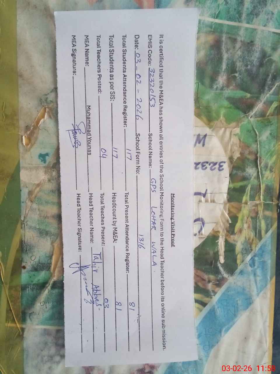 | EMIS Code: 32320153 | Name of School: GPS LOHAR WALA | |||