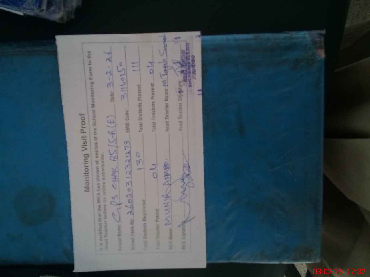 | Attendance Register | Head Teacher | MEA with School | Visit Proof |