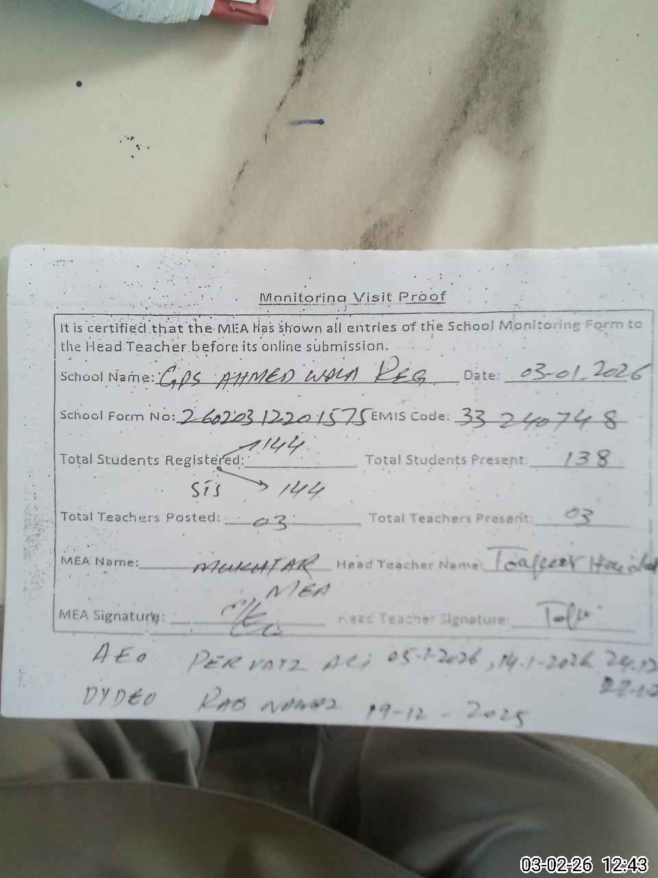 | Attendance Register | Head Teacher | MEA with School | Visit Proof |