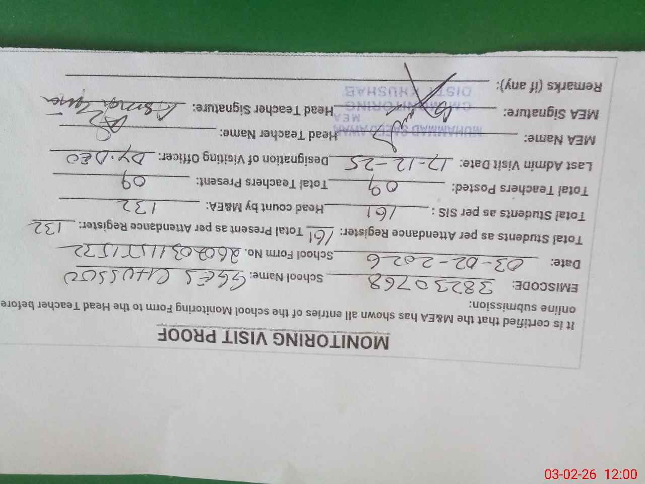 | Remarks (Use Separate Page if Required): Students on SIS Qty 161 Last admin visit On 17 December 2025 by Dy.DEO | |||||