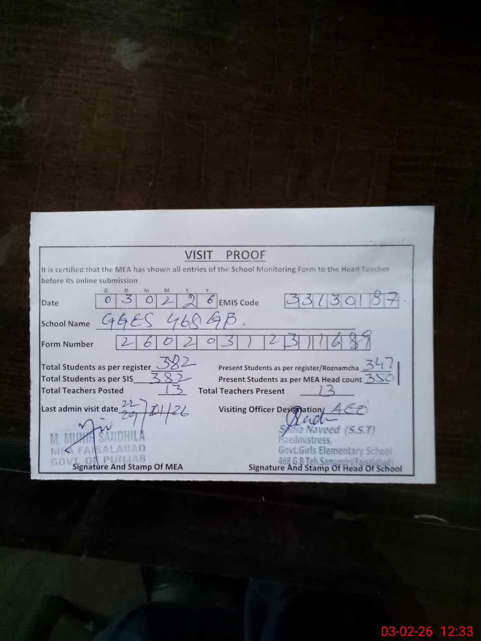 | Attendance Register | Head Teacher | MEA with School | Visit Proof |