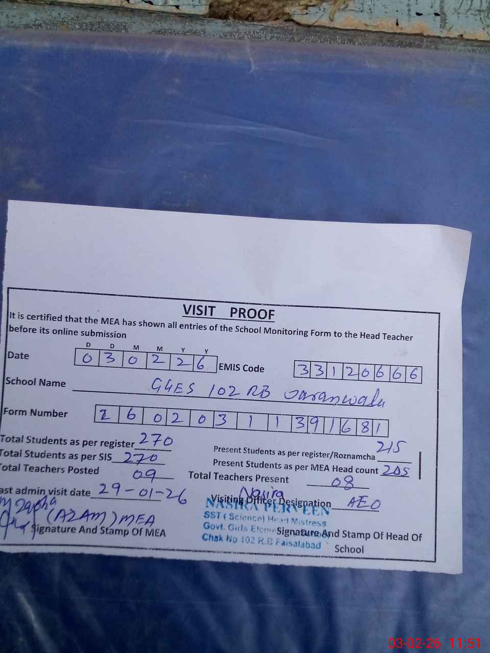 | EMIS Code: 33120666 | Name of School: GGES CHAK NO 102/RB | |||