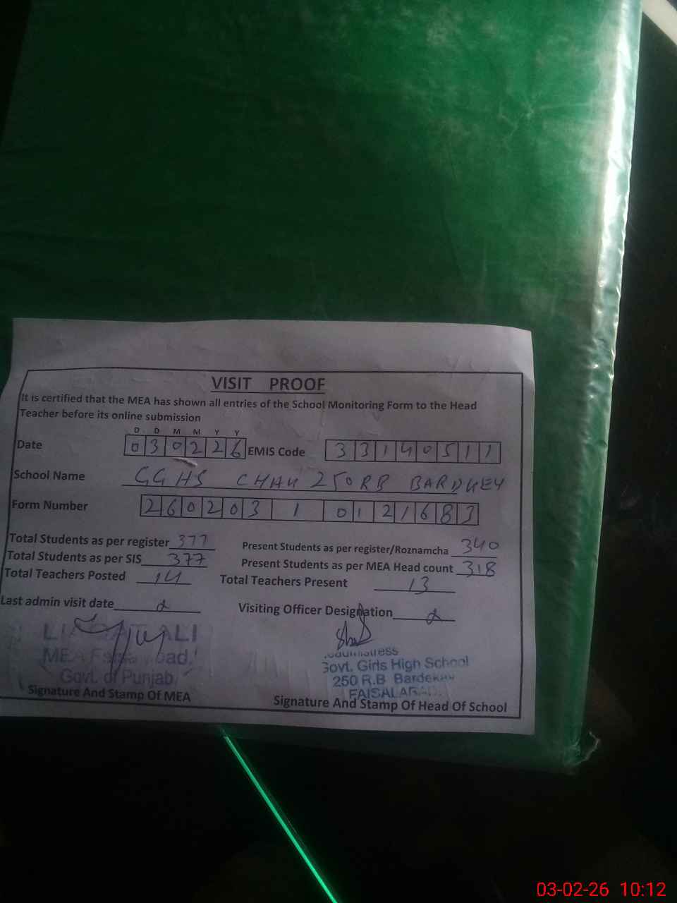 | EMIS Code: 33140511 | Name of School: GGHS CHAK 250 RB BARDAKEY | |||