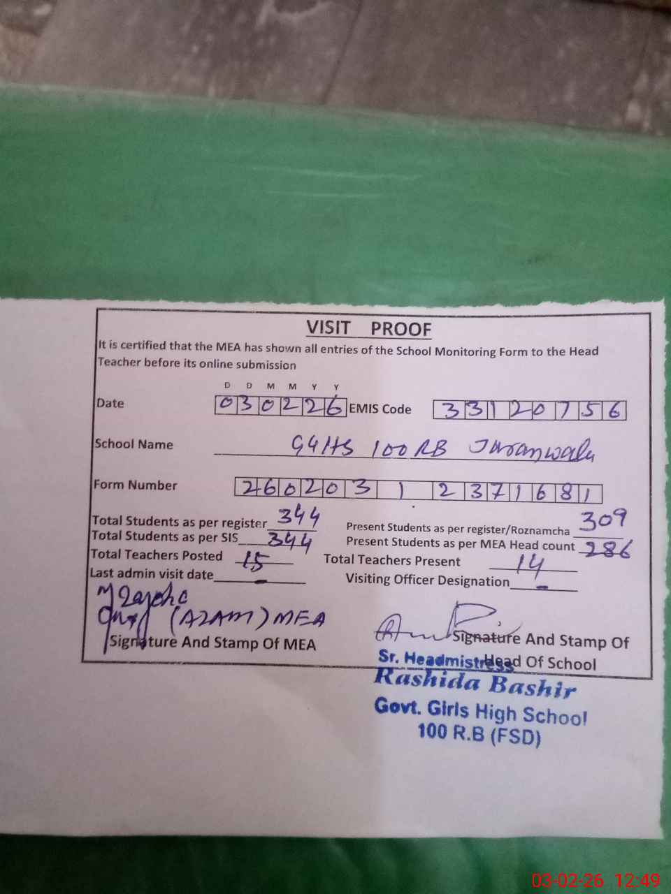 | EMIS Code: 33120756 | Name of School: GGHS CHAK 100 RB | |||