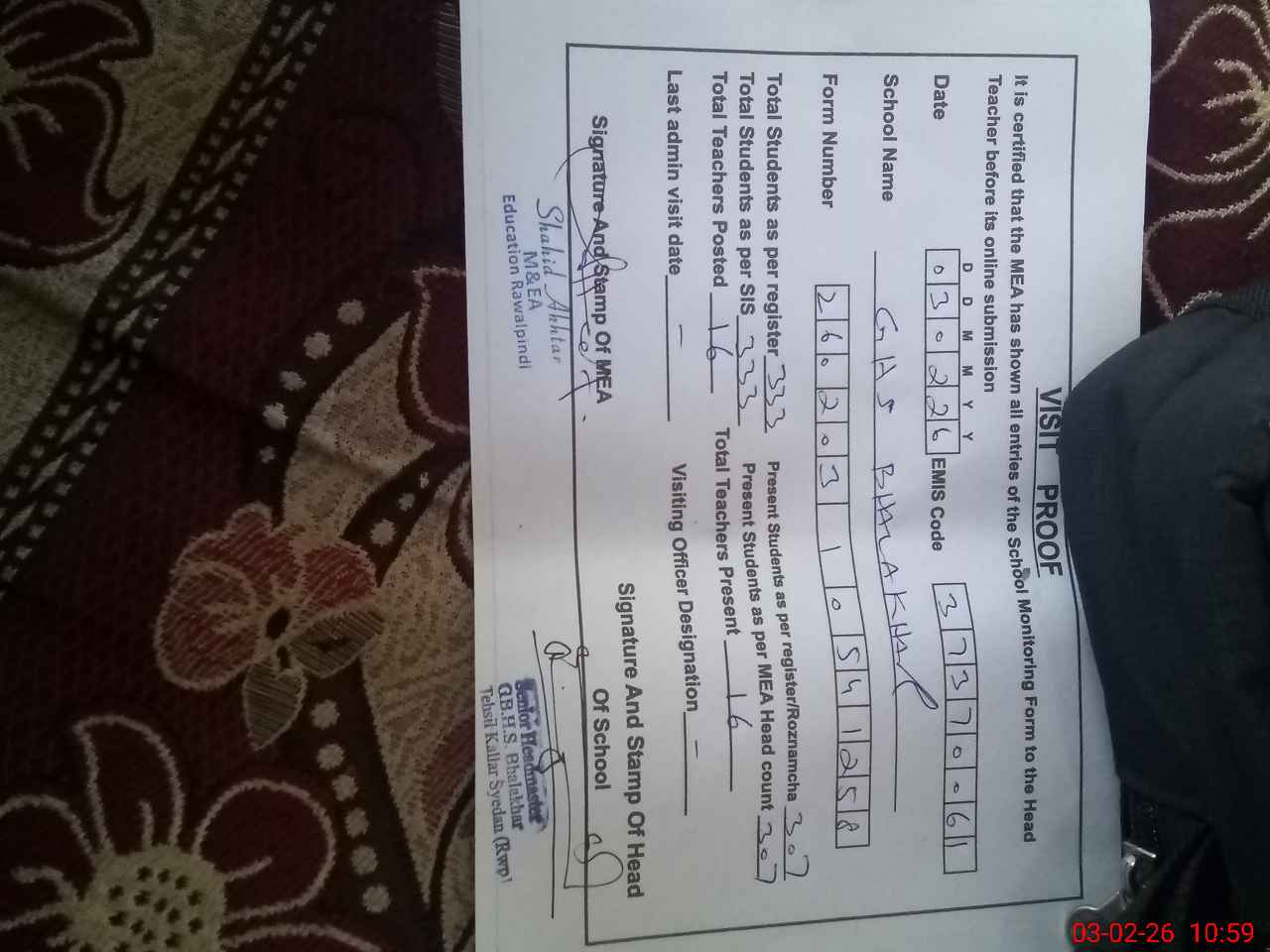 | Certified that this School was Inspected by the Undersigned MEA/DMO Today and the Information Stated Above is as Per Record. | |||||