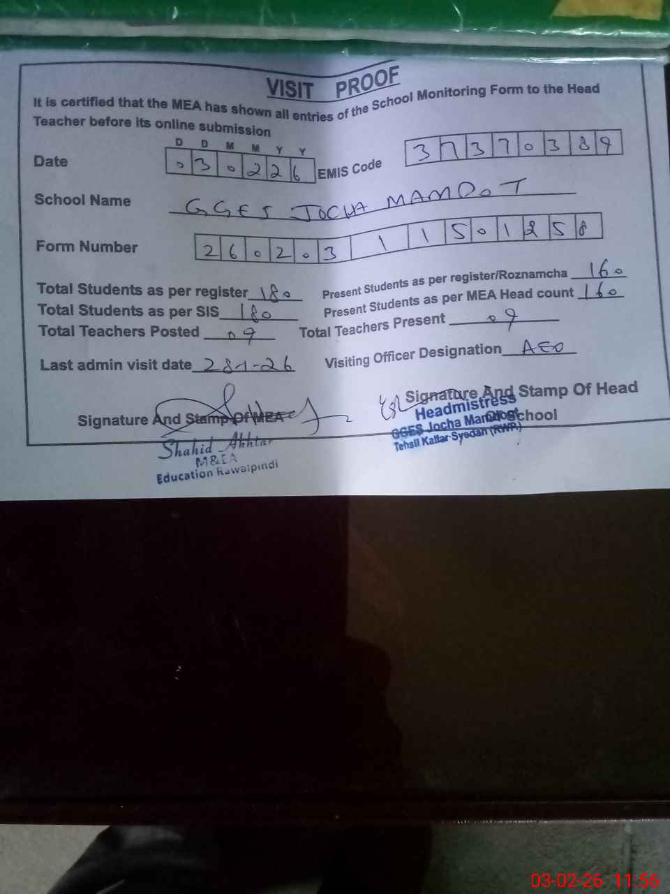 | Attendance Register | Head Teacher | MEA with School | Visit Proof |