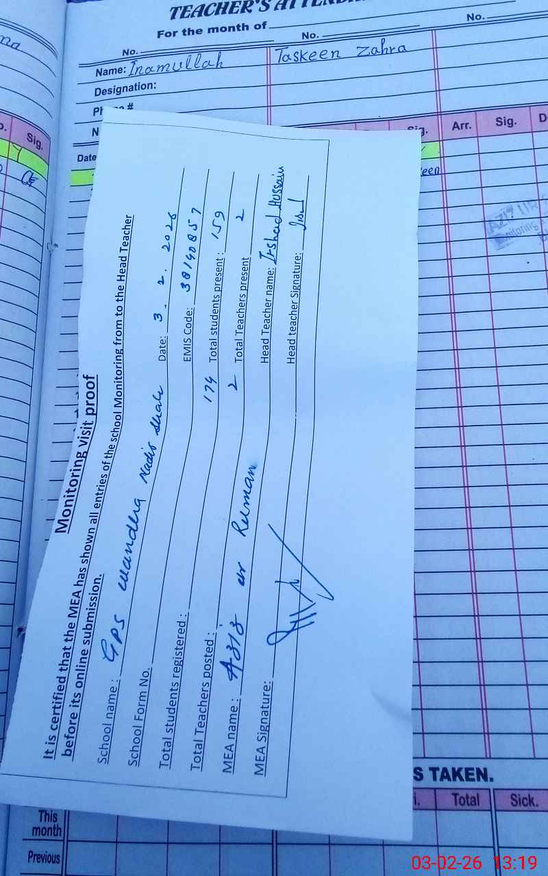 | Attendance Register | Head Teacher | MEA with School | Visit Proof |