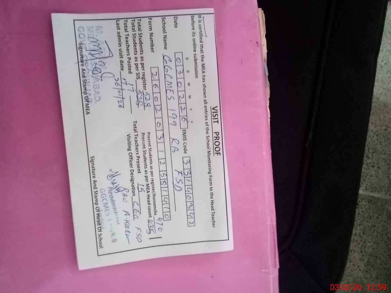 | Certified that this School was Inspected by the Undersigned MEA/DMO Today and the Information Stated Above is as Per Record. | |||||