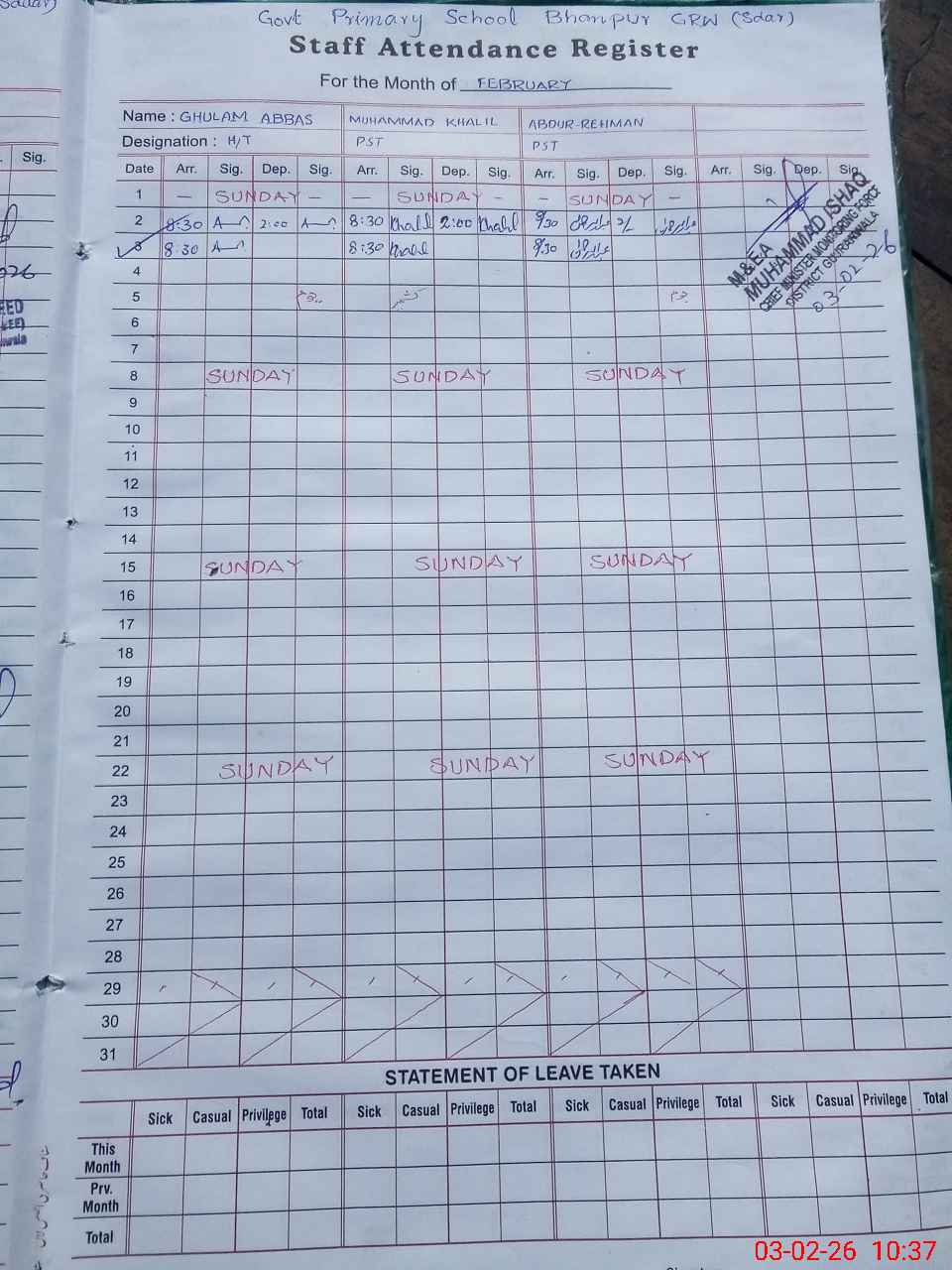 | Name: GH**** AB**** Designation: (School Headmaster's/Headmistress's) PST Phone/Cell Number: 03**** |
