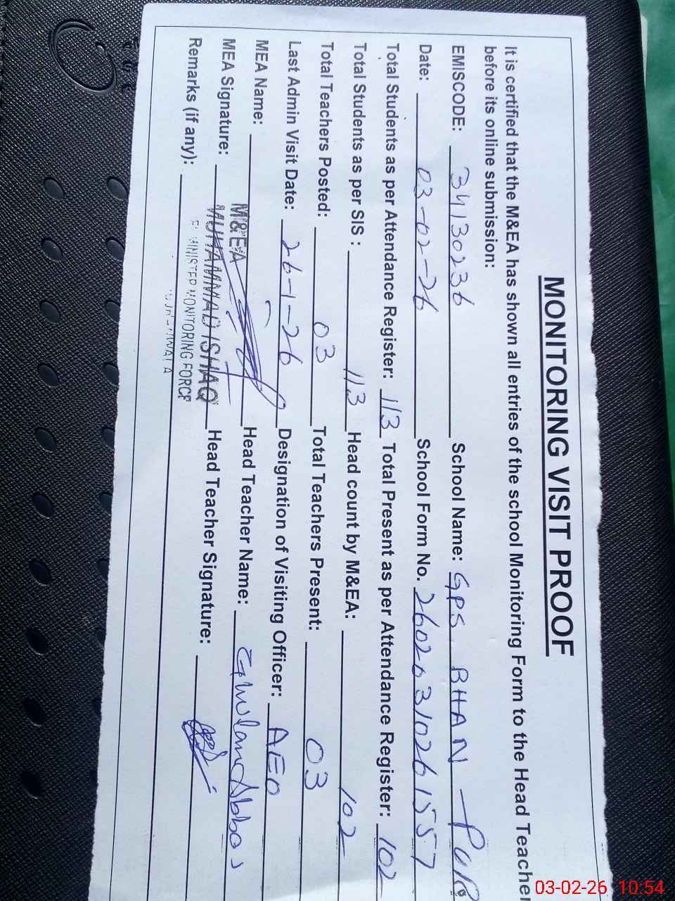 | Attendance Register | Head Teacher | MEA with School | Visit Proof |