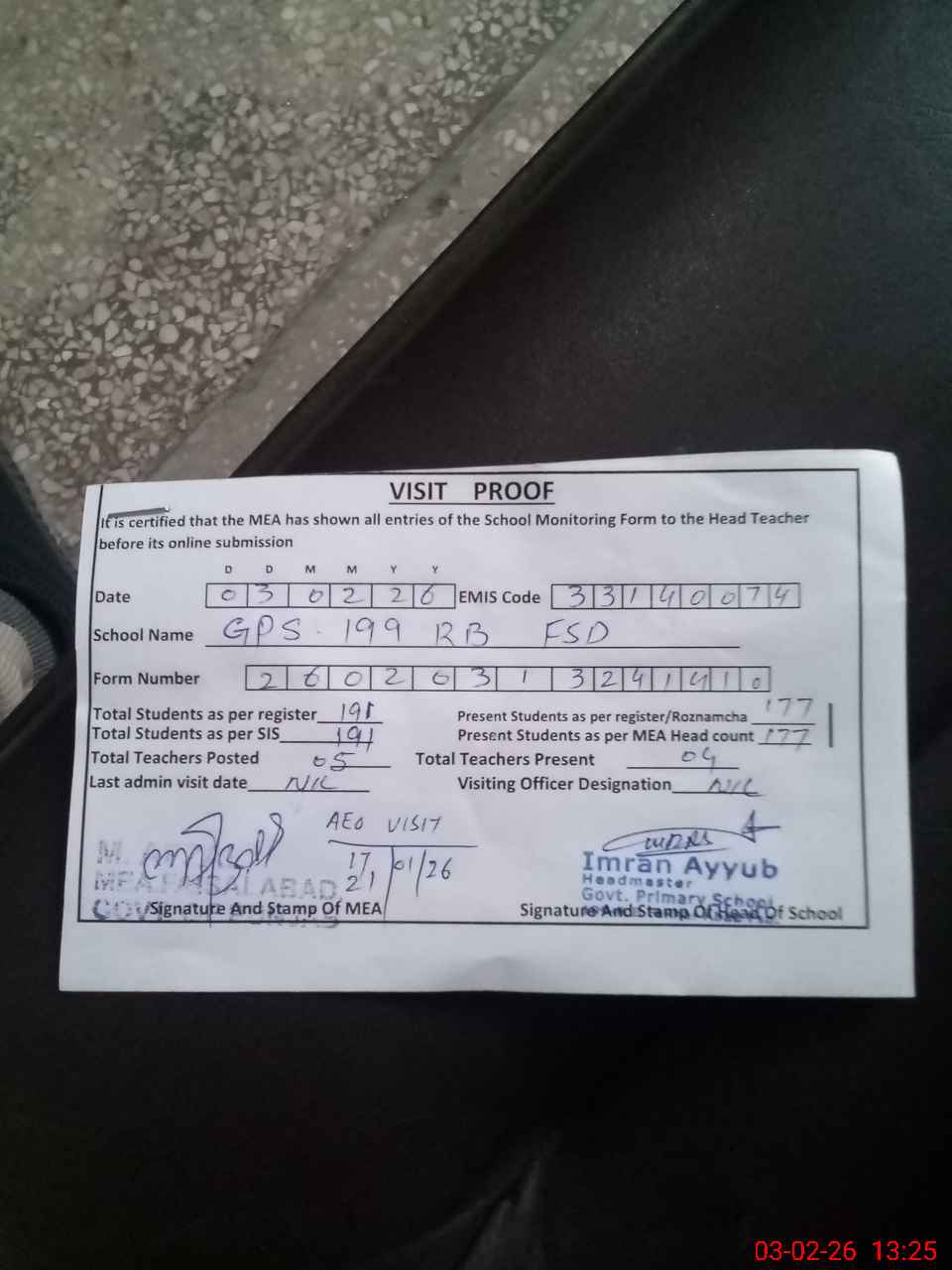 | Attendance Register | Head Teacher | MEA with School | Visit Proof |