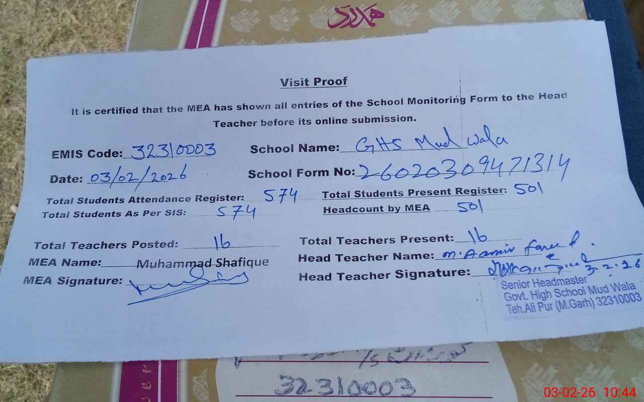 | EMIS Code: 32310003 | Name of School: GHS MUD WALA | |||