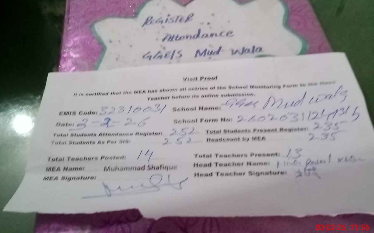 | Attendance Register | Head Teacher | MEA with School | Visit Proof |