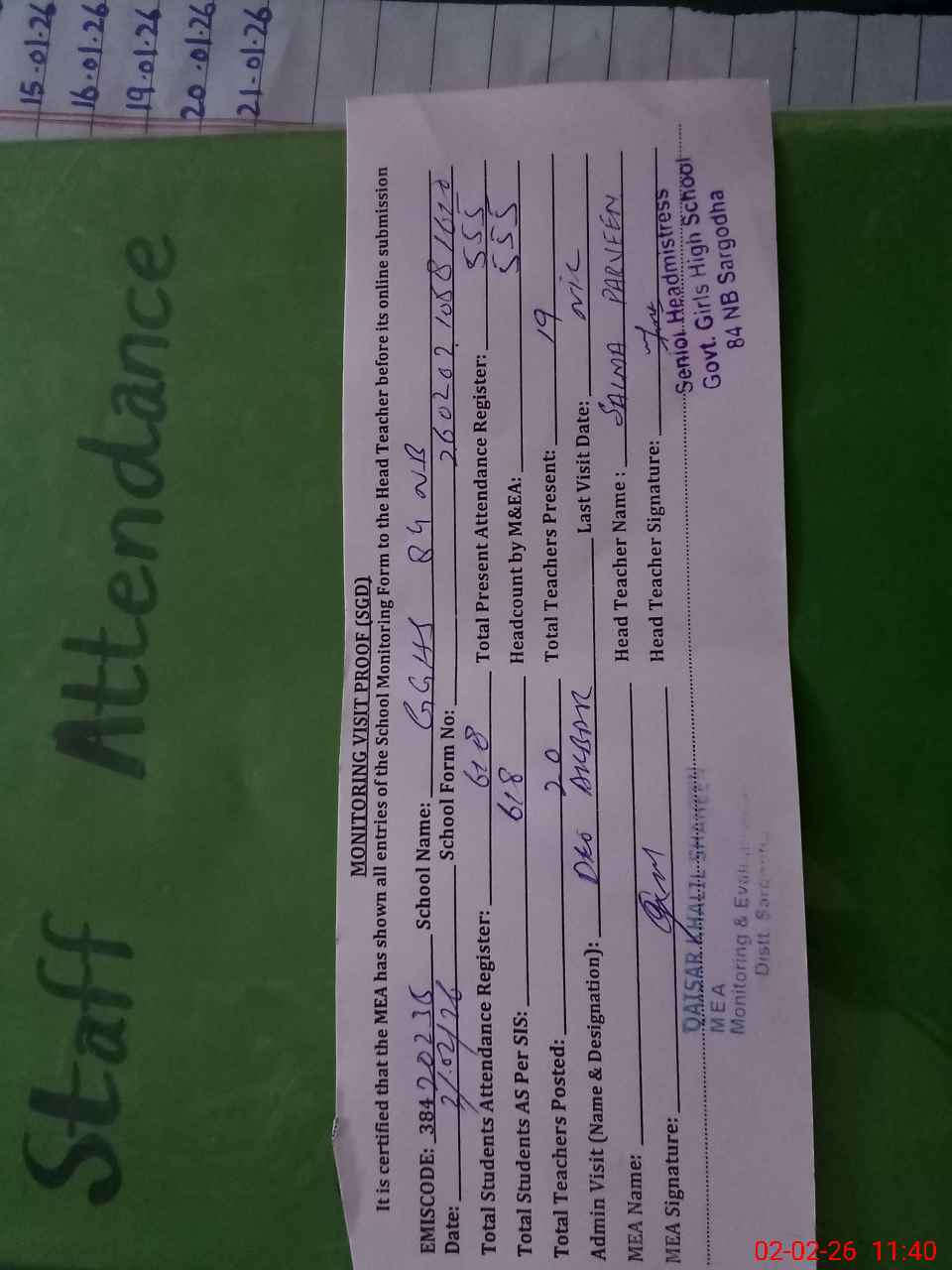 | Attendance Register | Head Teacher | MEA with School | Visit Proof |