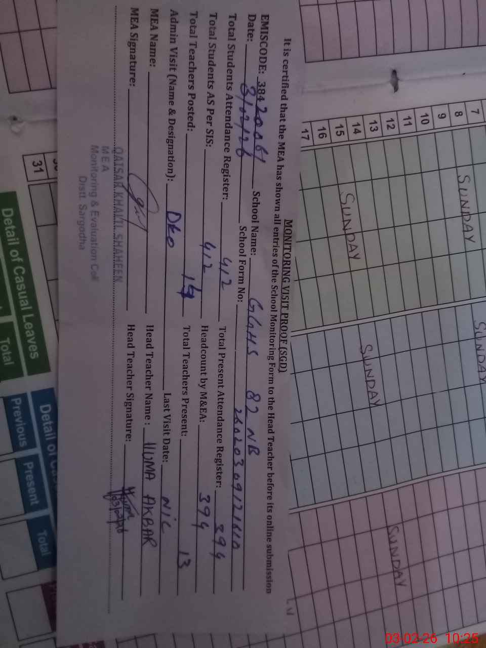 | Attendance Register | Head Teacher | MEA with School | Visit Proof |