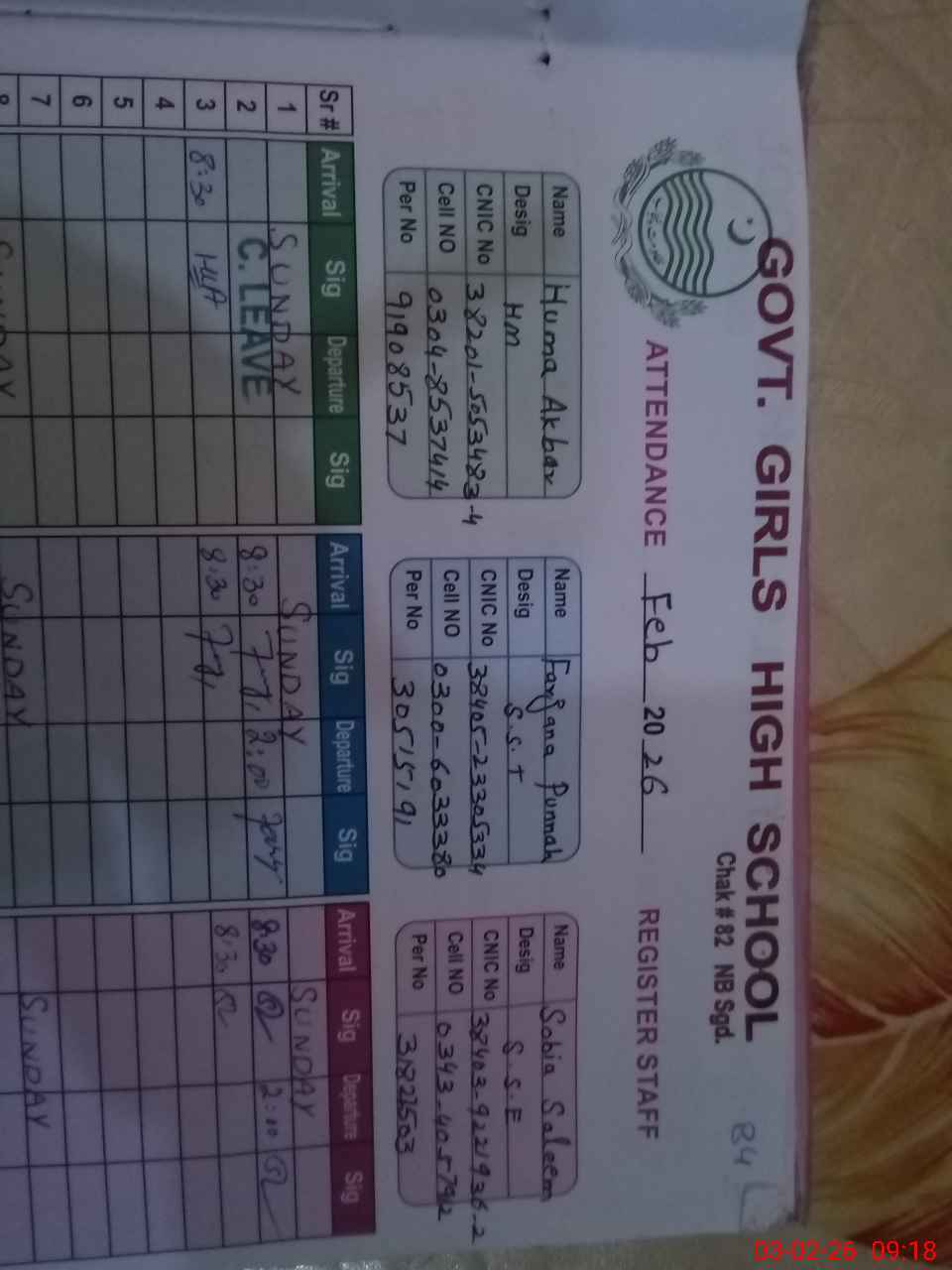 | CNIC | Full Name | Designation | R/C | Absence During Last Calender Month |
