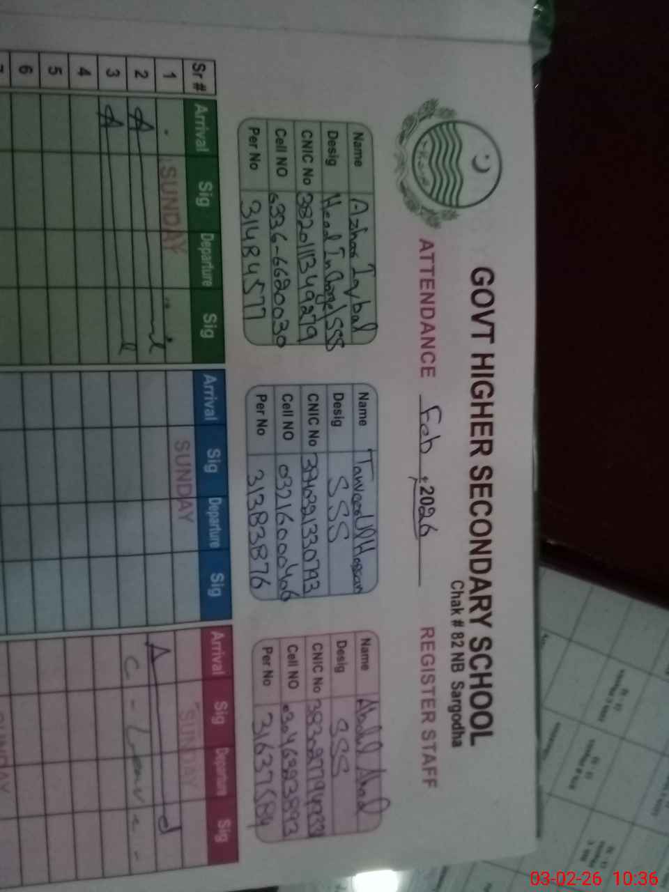 | CNIC | Full Name | Designation | R/C | Absence During Last Calender Month |