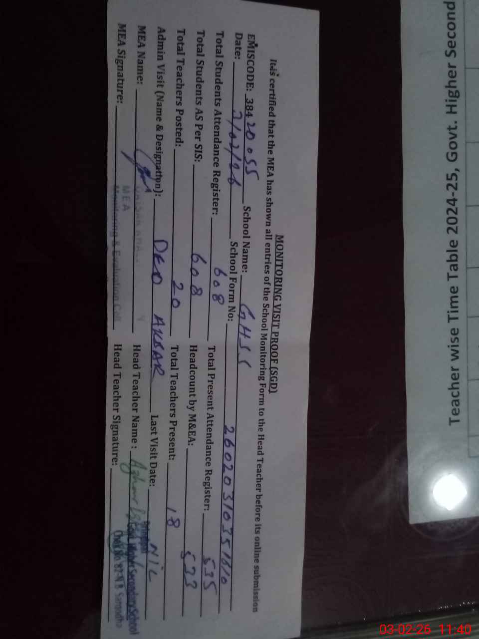 | Attendance Register | Head Teacher | MEA with School | Visit Proof |