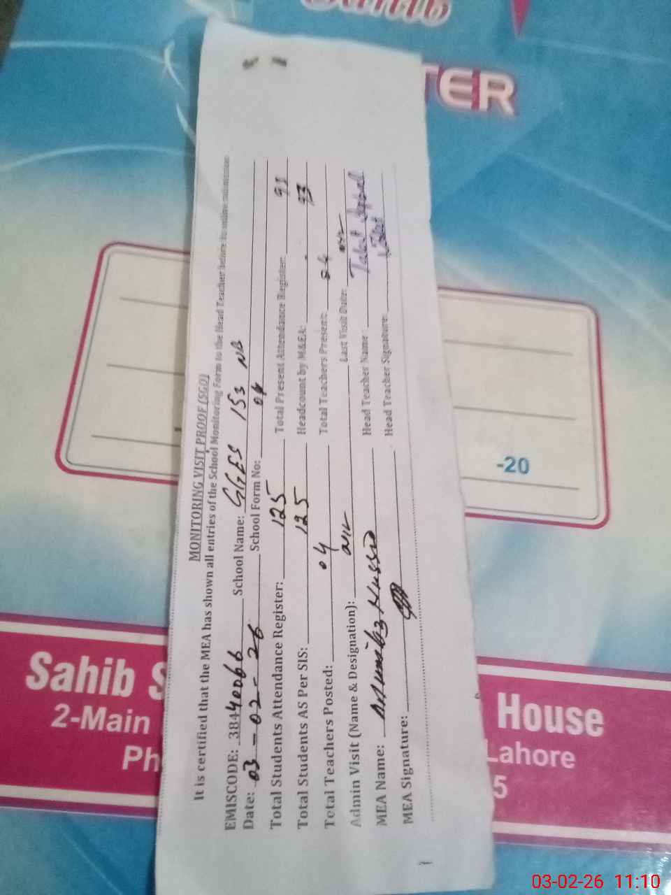| Attendance Register | Head Teacher | MEA with School | Visit Proof |