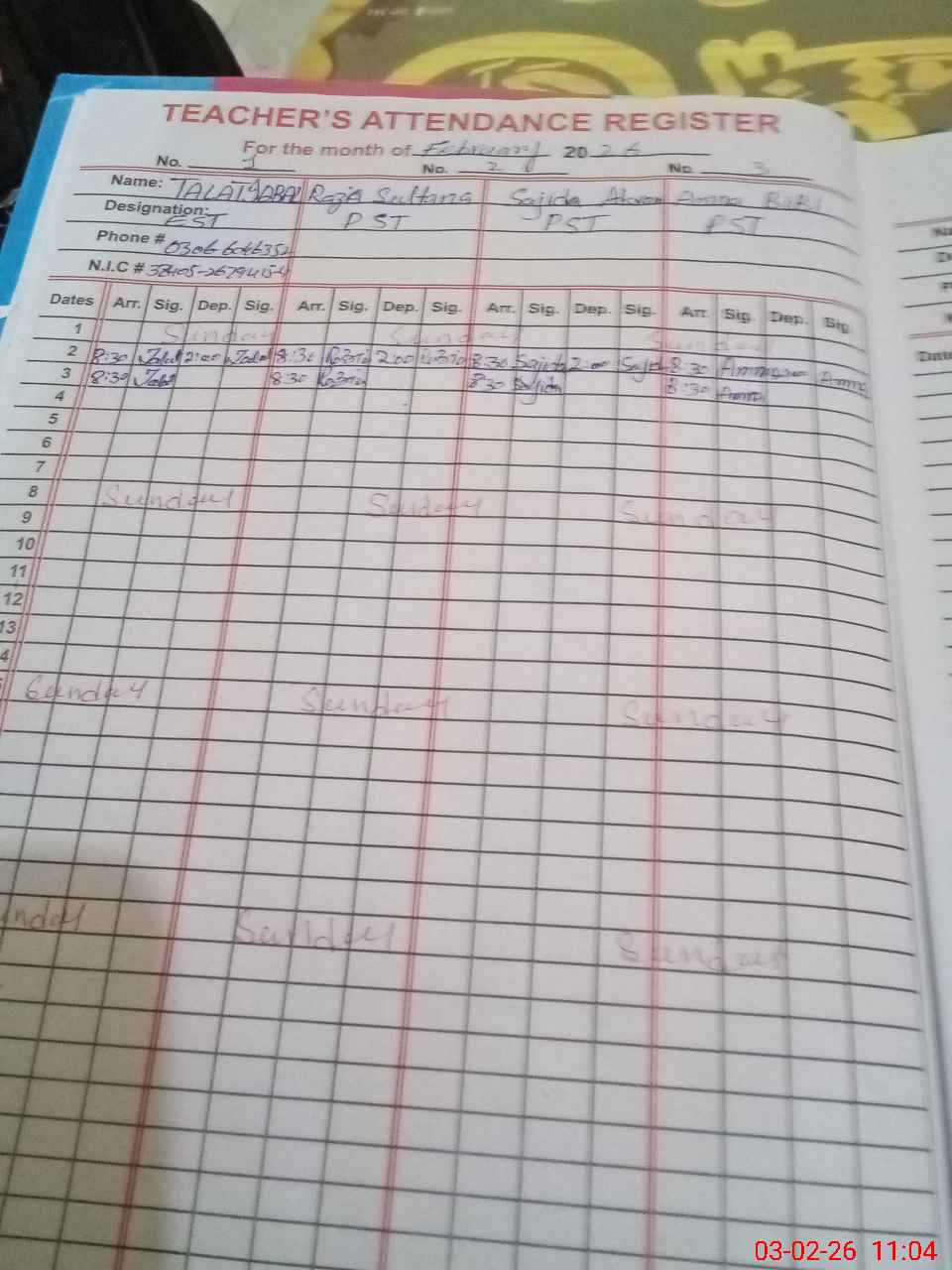 | Name: TA**** IQ**** Designation: (School Headmaster's/Headmistress's) EST Phone/Cell Number: 03**** |