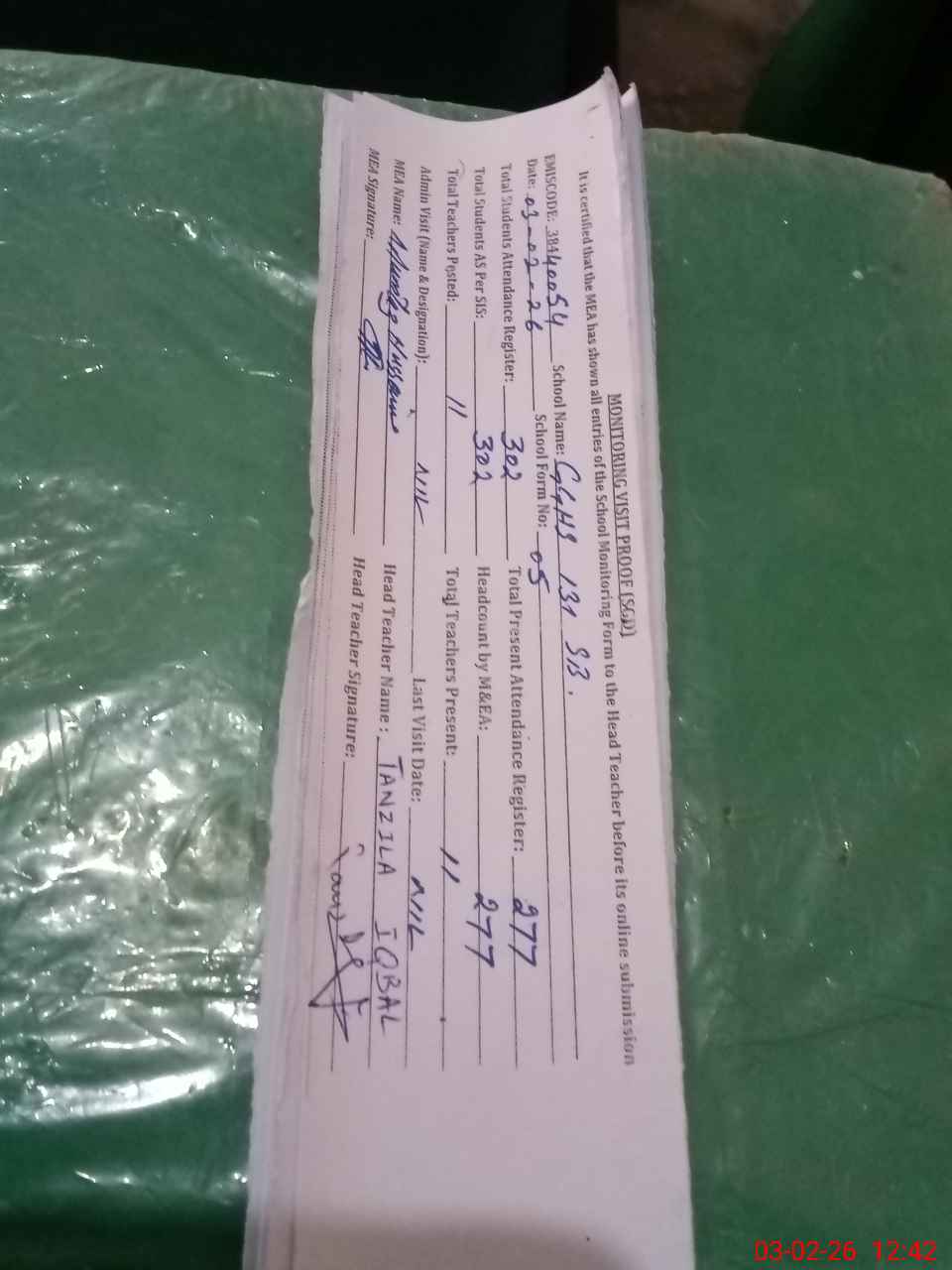 | Attendance Register | Head Teacher | MEA with School | Visit Proof |