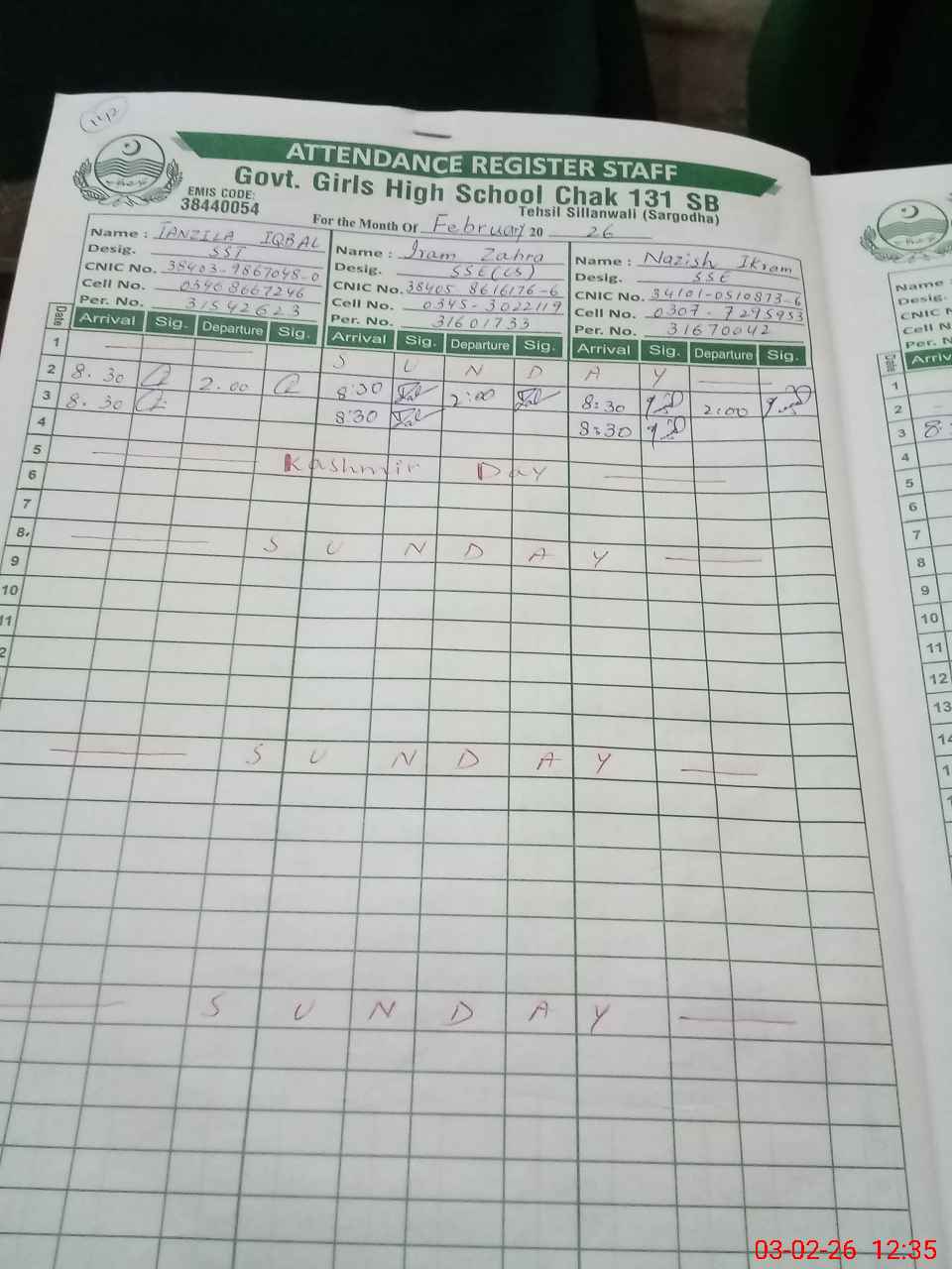 | Name: TA**** IQ**** Designation: (School Headmaster's/Headmistress's) SSE (PHY MATH) Phone/Cell Number: 03**** |