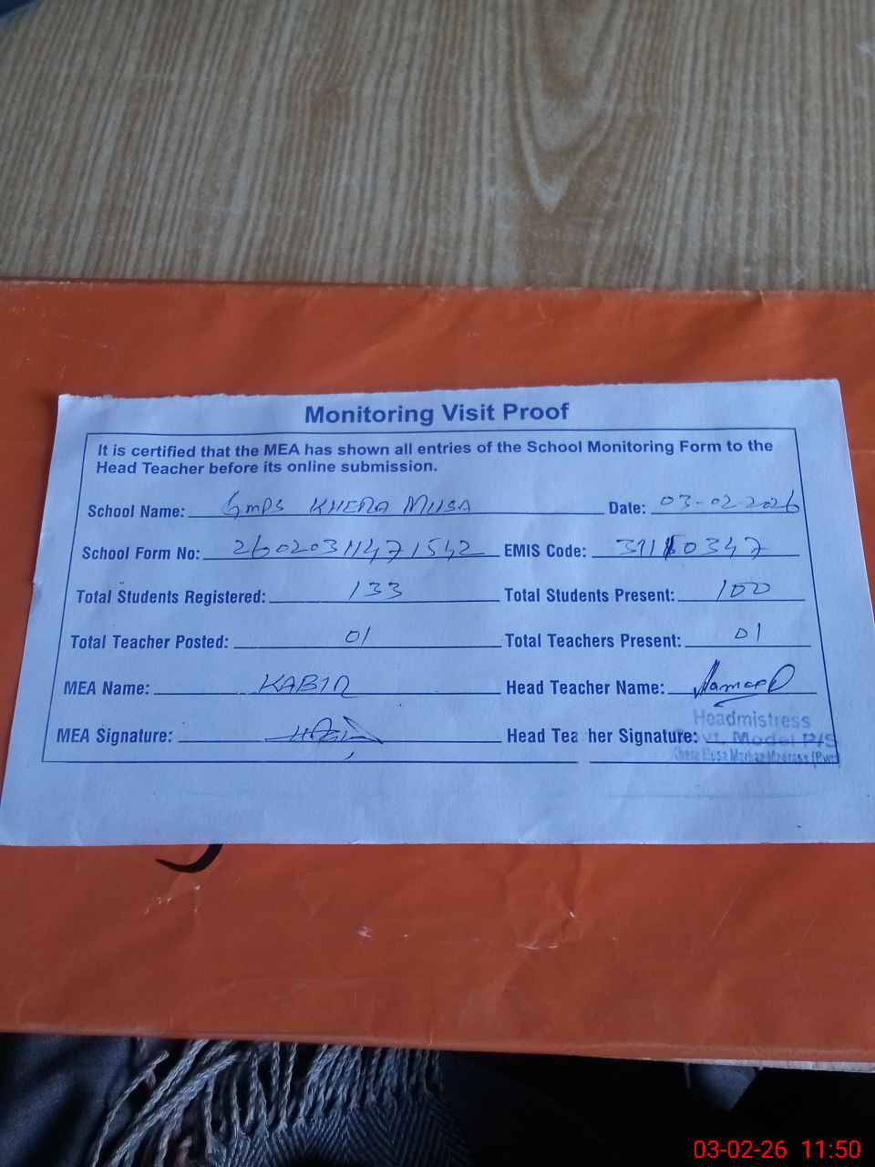 | Attendance Register | Head Teacher | MEA with School | Visit Proof |
