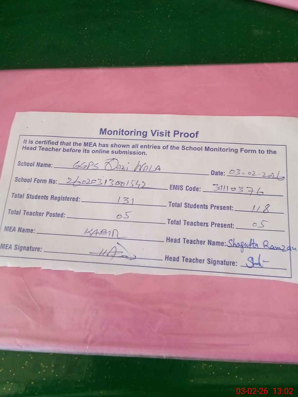 | Attendance Register | Head Teacher | MEA with School | Visit Proof |