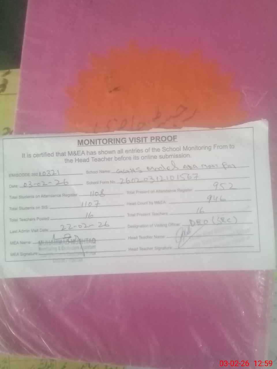 | Attendance Register | Head Teacher | MEA with School | Visit Proof |
