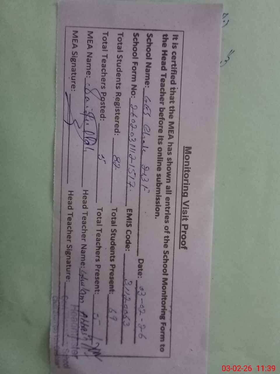 | Attendance Register | Head Teacher | MEA with School | Visit Proof |