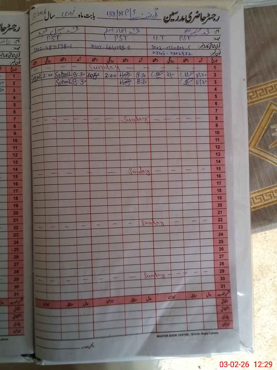 | CNIC | Full Name | Designation | R/C | Absence During Last Calender Month |