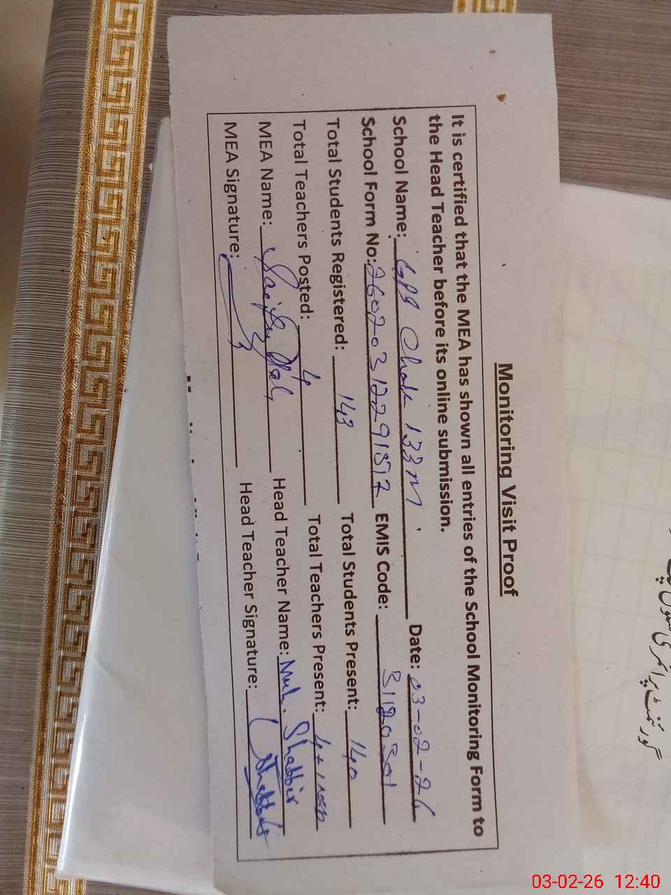| Attendance Register | Head Teacher | MEA with School | Visit Proof |