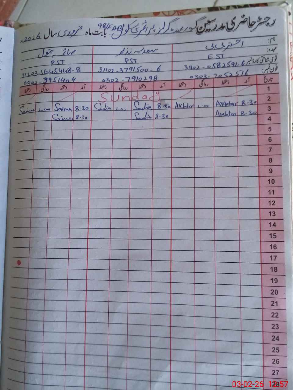 | CNIC | Full Name | Designation | R/C | Absence During Last Calender Month |