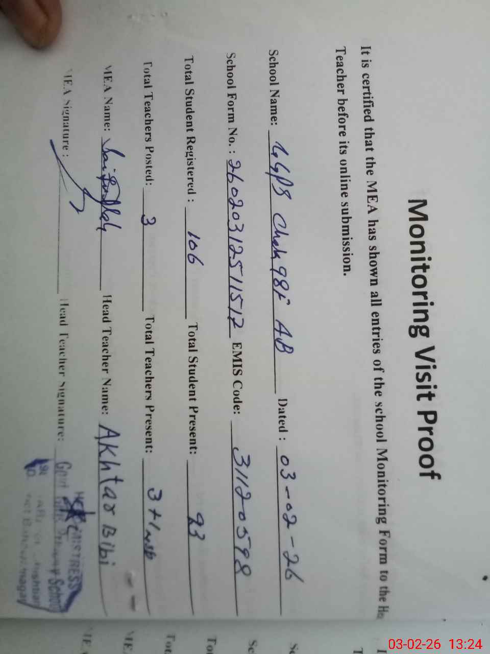 | Attendance Register | Head Teacher | MEA with School | Visit Proof |