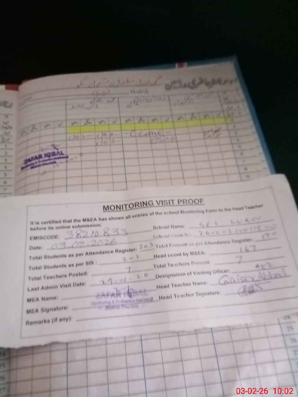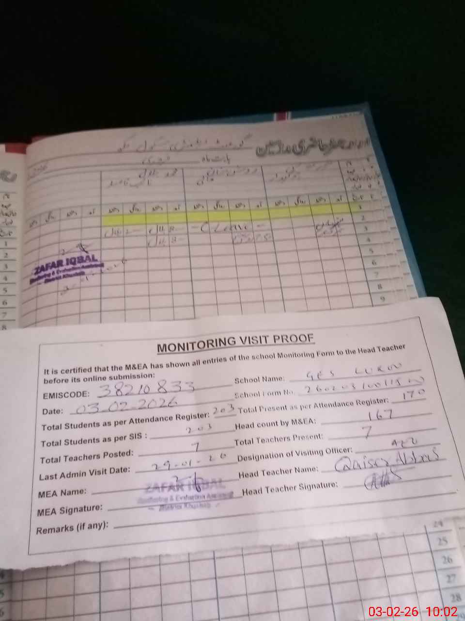 | Remarks (Use Separate Page if Required): last visit AEO 28 Jan 26 Total on register 203 Total on sis 203 | |||||