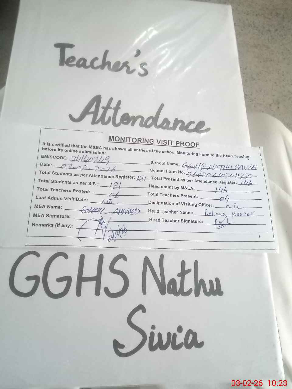| Attendance Register | Head Teacher | MEA with School | Visit Proof |