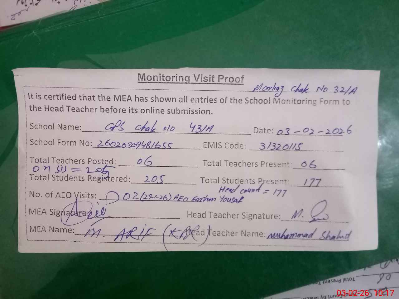| Attendance Register | Head Teacher | MEA with School | Visit Proof |