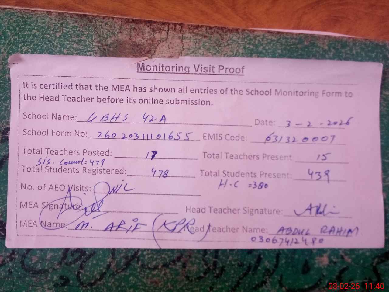 | EMIS Code: 31320007 | Name of School: GHS CHAK 42 A | |||