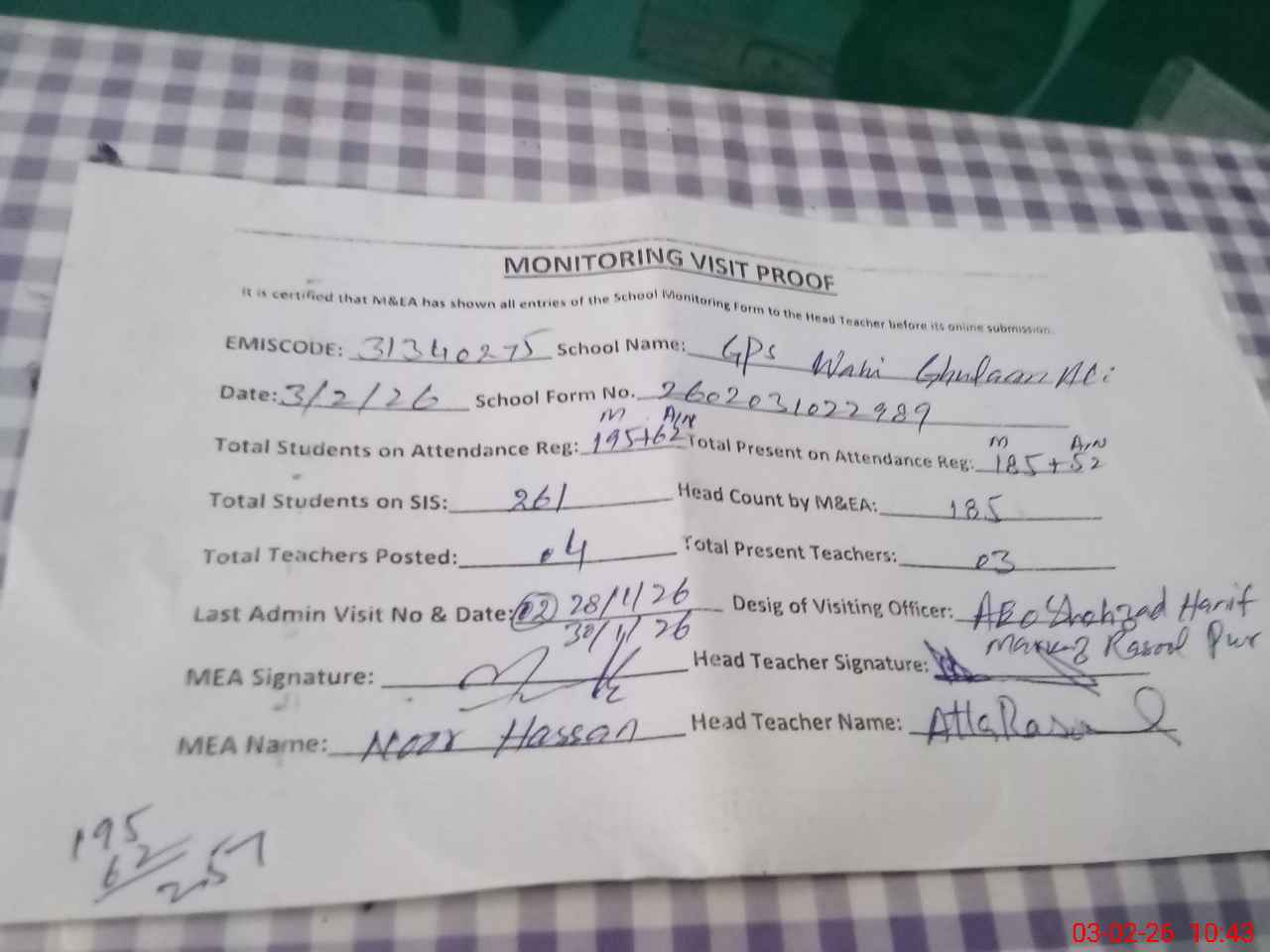 | Attendance Register | Head Teacher | MEA with School | Visit Proof |