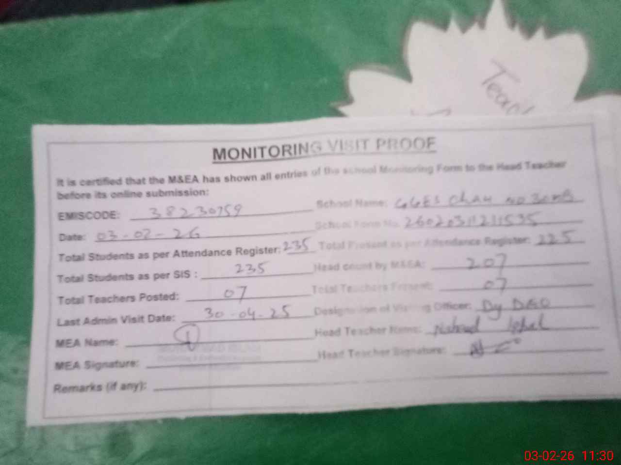 | Remarks (Use Separate Page if Required): Dy DEO visited school on 30 April 2025 students strength on sis 235 | |||||