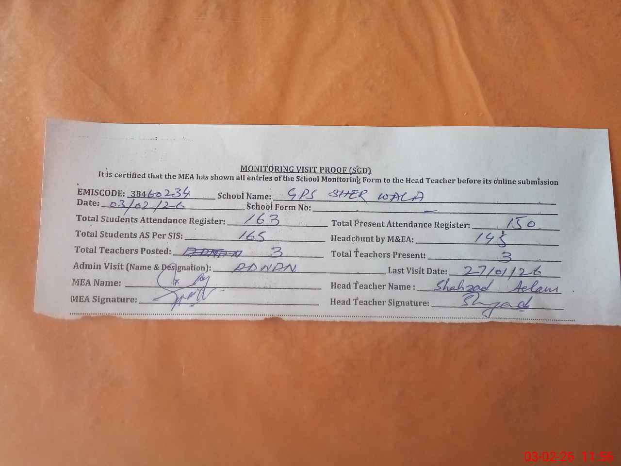 | Attendance Register | Head Teacher | MEA with School | Visit Proof |
