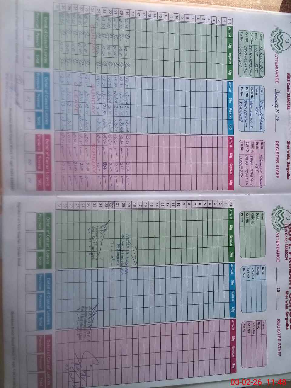 | CNIC | Full Name | Designation | R/C | Absence During Last Calender Month |