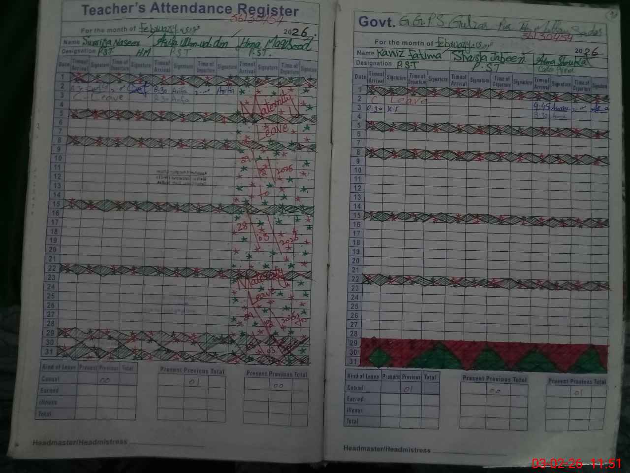 | 36**** | Hi**** Ma**** | PST Arts | Regular | 0 | 0 | 0 | 0 | 0 | 0 | 0 | 0 | 0 | Maternity |