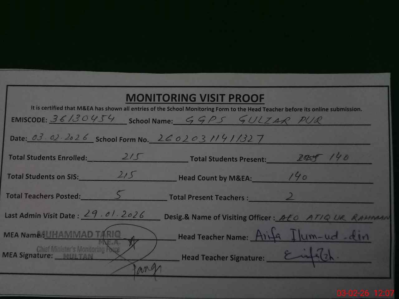| Attendance Register | Head Teacher | MEA with School | Visit Proof |