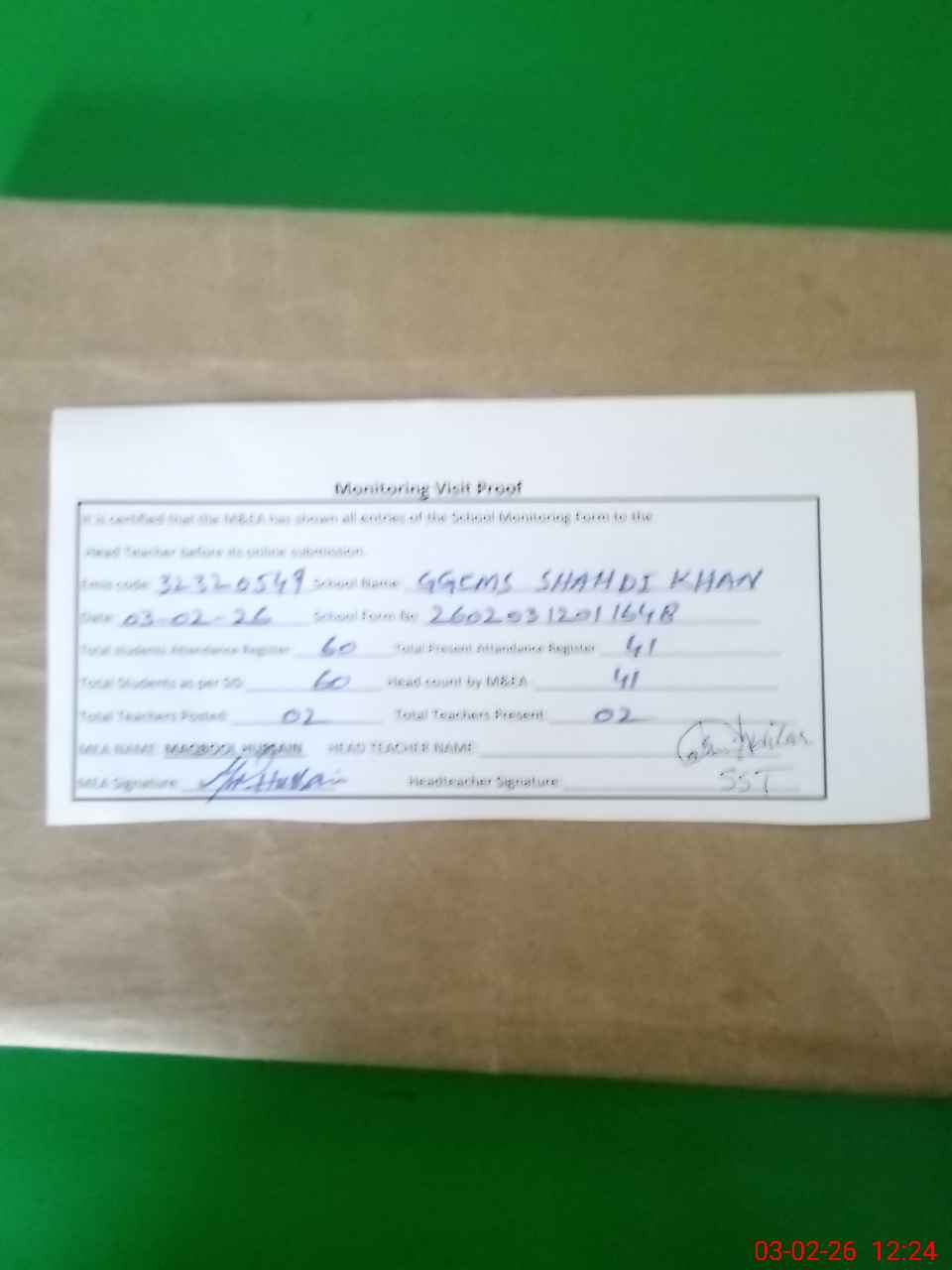 | Attendance Register | Head Teacher | MEA with School | Visit Proof |