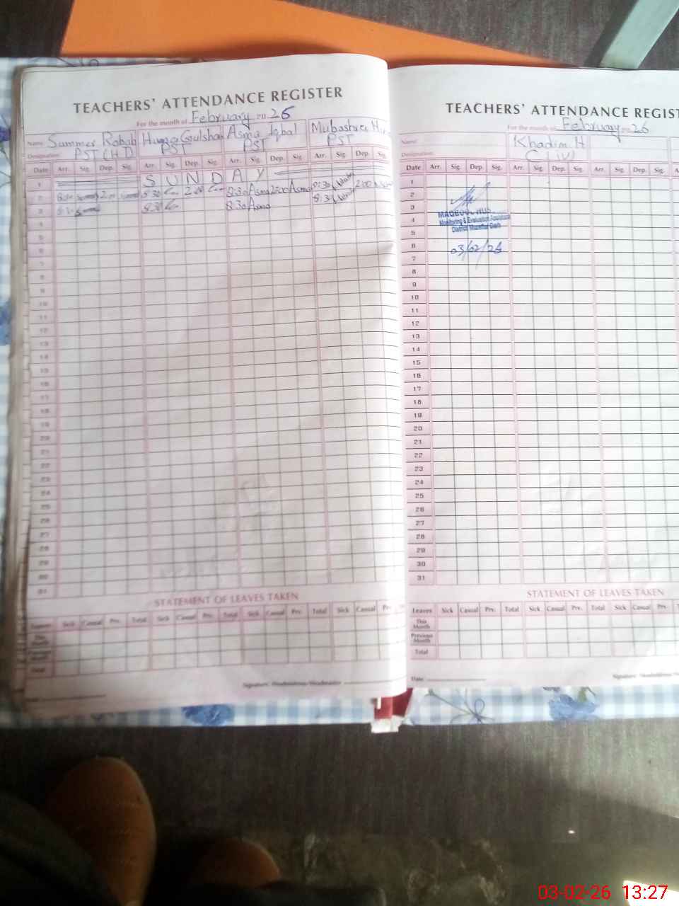 | Remarks (Use Separate Page if Required): Total students are 51 But teachers are 04 School hygienically very poor Boundary wall is totally damaged | |||||