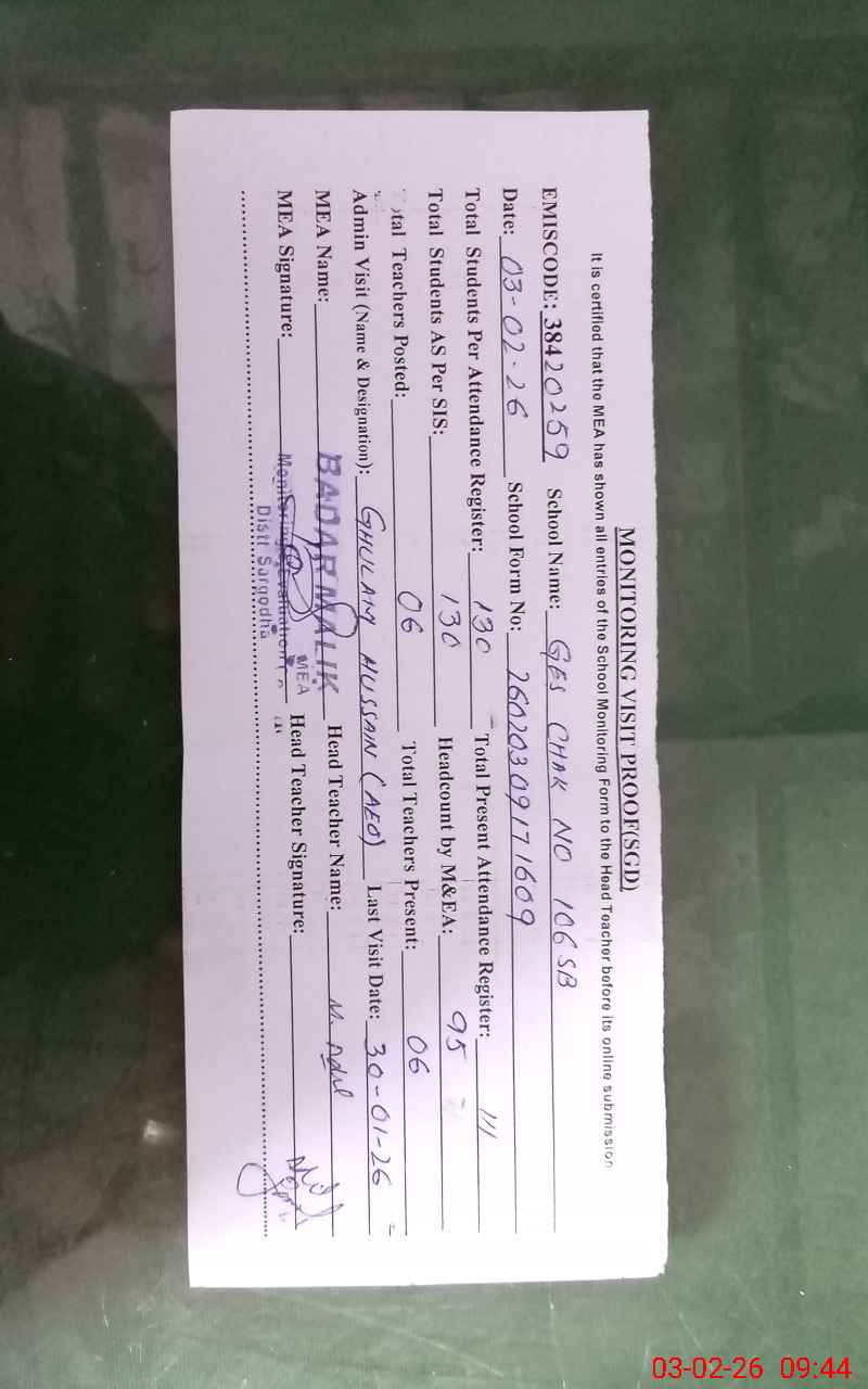 | EMIS Code: 38420259 | Name of School: GES CHAK NO.106 SB | |||