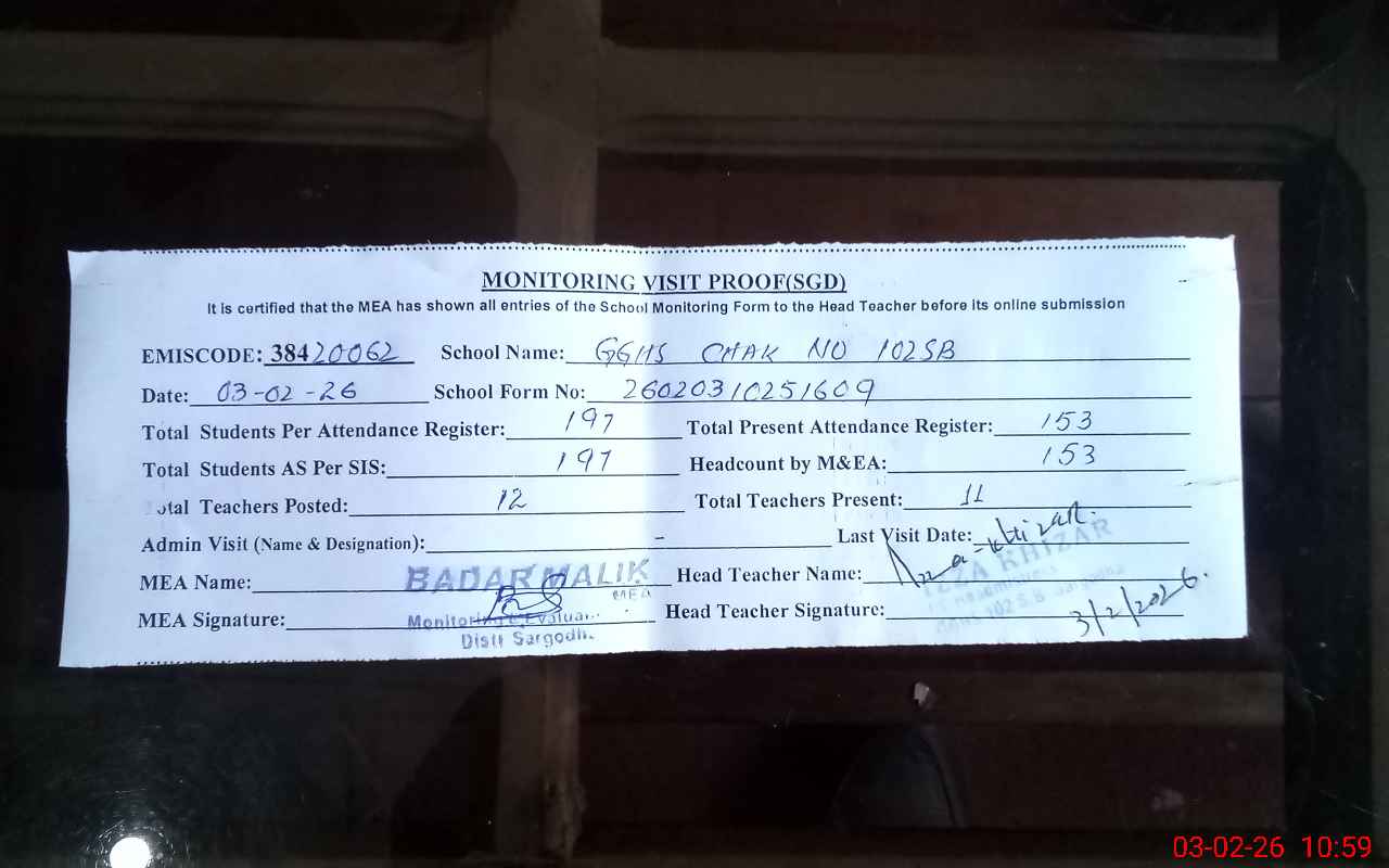 | EMIS Code: 38420062 | Name of School: GGHS CHAK NO.102 SB | |||