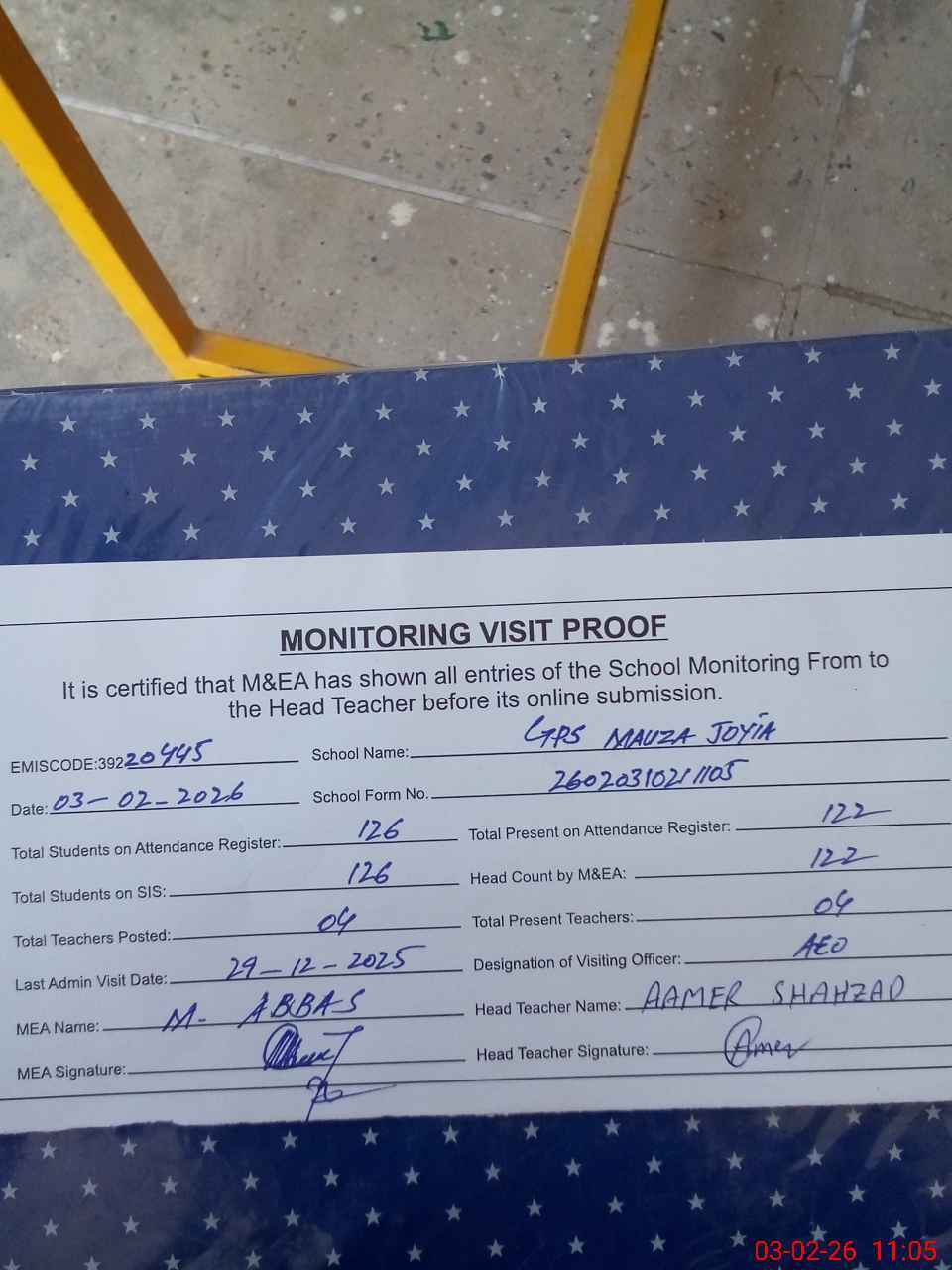 | Attendance Register | Head Teacher | MEA with School | Visit Proof |