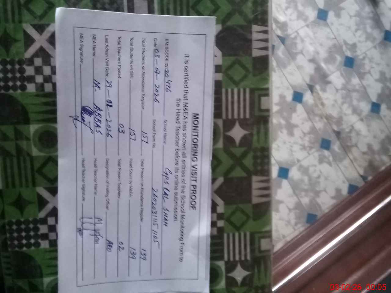 | Attendance Register | Head Teacher | MEA with School | Visit Proof |
